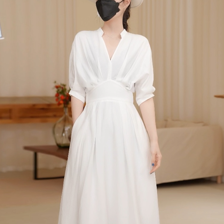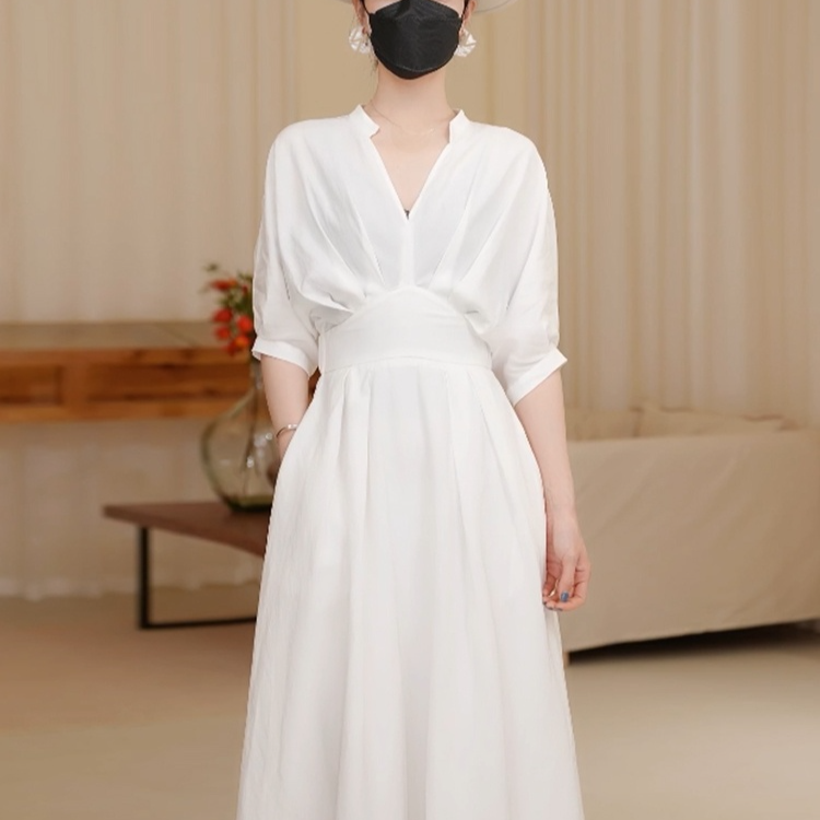 春夏秋にぴったりなVネックロングワンピース屋外撮影